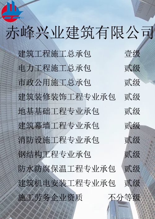 赤峰興業建筑有限公司簡介 赤峰興業建筑有限公司成立于1998年7月,位于內蒙古赤峰市松山區?,F已發展成為擁有建筑工程施工總承包壹級、電力工程施工總承包貳級、市政公用工程施工總承包貳級、承裝、修、試四級、?建筑裝修裝飾工程專業承包貳級、建筑幕墻工程專業承包貳級、消防設施工程專業承包貳級、地基基礎工程專業承包貳級、鋼結構工程專業承包貳級、建筑機電工程專業承包二級、防水防腐保溫工程專業承包貳級以及建筑施工勞務等資質的綜合性建筑施工企...